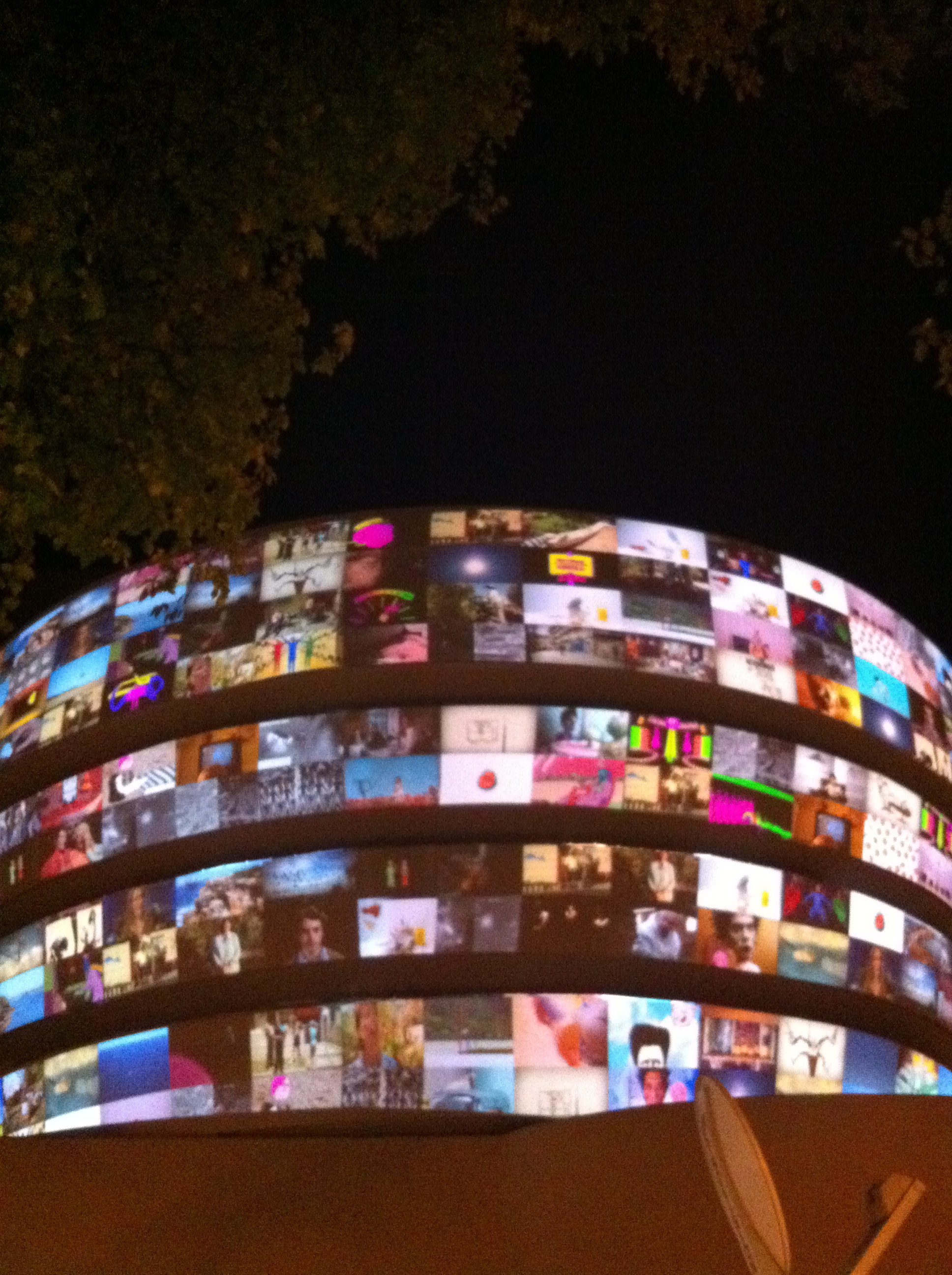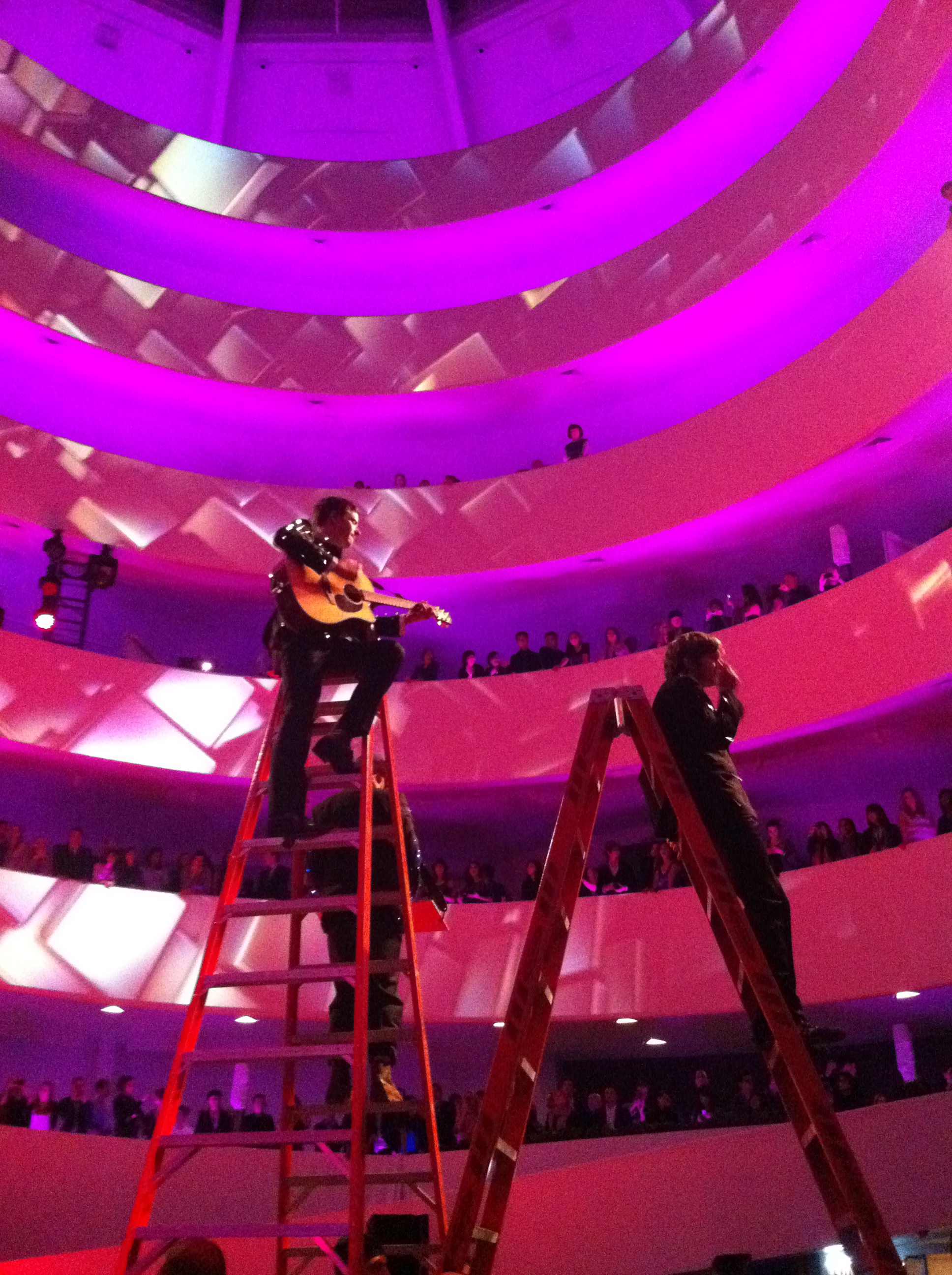 The other night I went to the Guggenheim for what can only be described as an Only In New York Night. It was the opening of the Play Biennial, a new initiative from YouTube and the Guggenheim to celebrate creativity and innovation in film. Of 23,300 entrants, 125 films made it onto the shortlist, while 25 finalists are now on show as part of a weekend-long exhibit. To kick things off, there was a big old party, with snippets of film projected onto a screen in the rotunda of the Guggenheim, as well as onto both interior and exterior walls of the museum. The projections (my footage of the outside of the building shown, above and a still, below left) were put together by Obscura Digital, which mapped the imagery seamlessly, transforming Frank Lloyd Wright’s iconic museum into an epic dreamscape. The LXD performed a jawdroppingly athletic dance piece while YouTube folk heroes OK Go performed two songs while standing up ladders (below, right). The whole thing was truly magical. As my friend June involuntarily shouted at one point, “Look at that!” We all did, and it was good. See all the films that made the shortlist here.