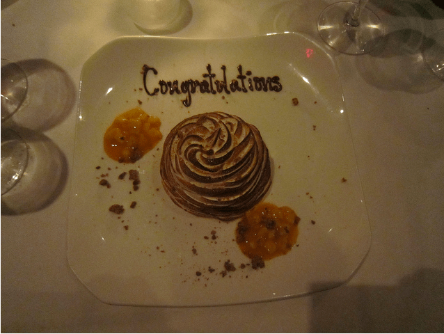 Giving a bride-to-be an unsolicited dessert with the word “congratulations” written on the plate makes her very happy. It also makes the organizers very happy that they went to that venue.